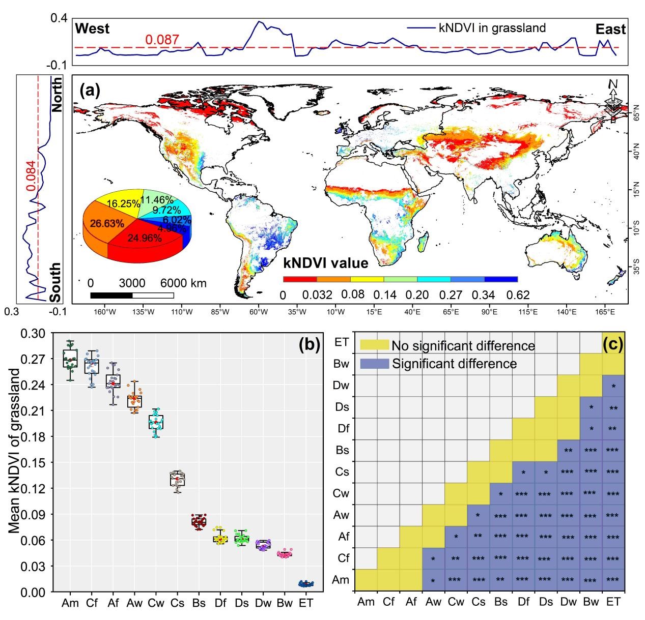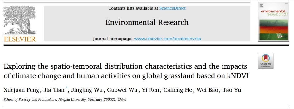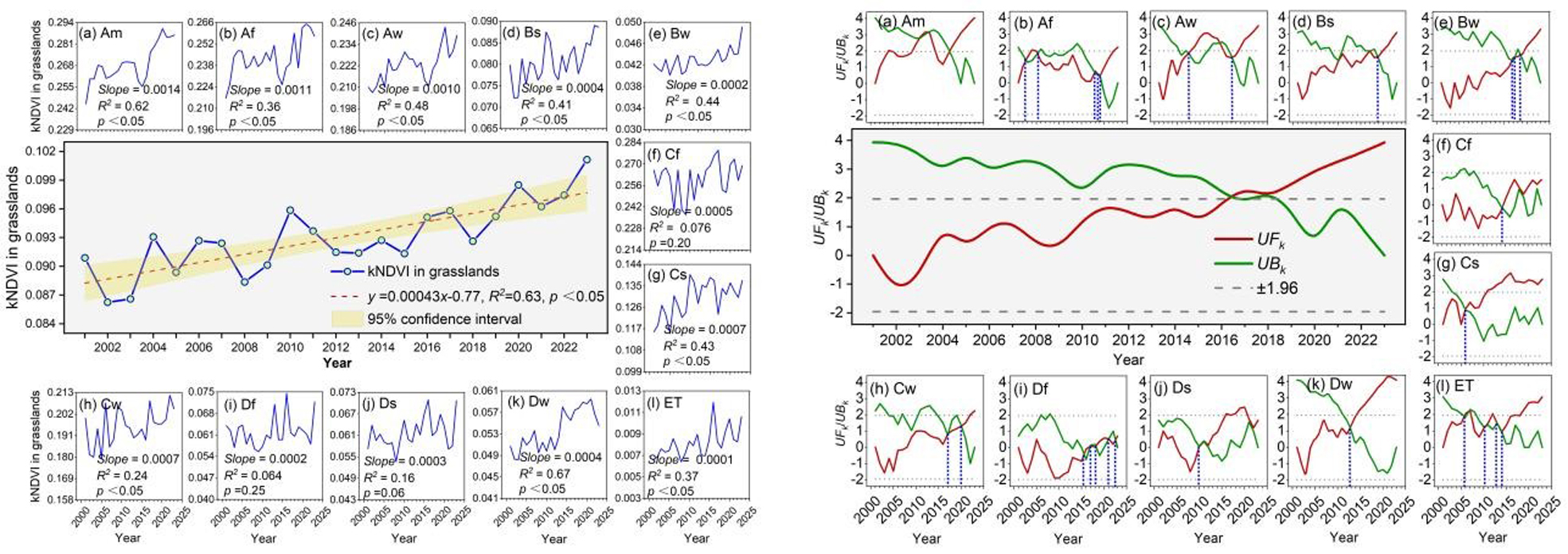 水土保持与荒漠化防治团队在《Environmental Research》(IF=7.7)发表研究,基于2001-2023年全球草原数据,借助谷歌地球引擎(GEE)和核归一化植被指数(kNDVI),揭示全球草原时空变化及驱动力。
